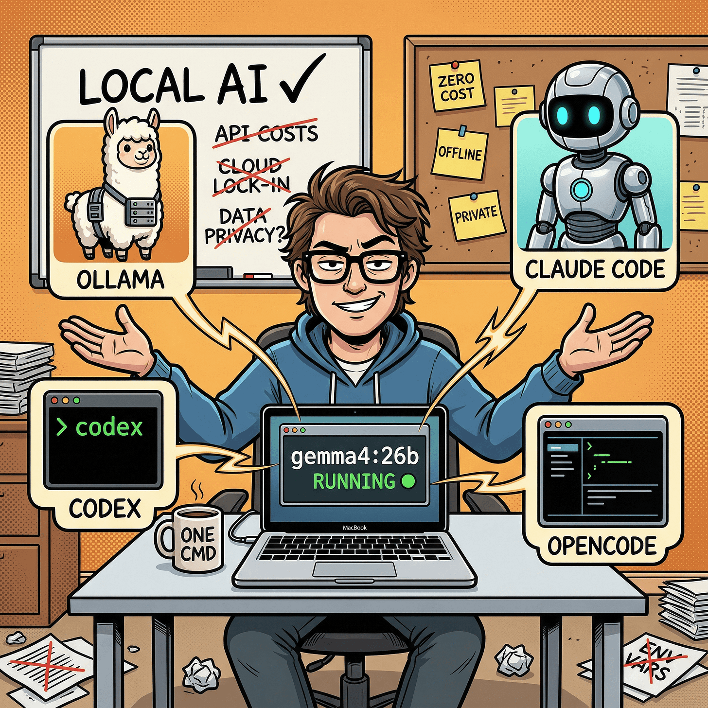 This guide covers the full path: installing Ollama, pulling Gemma 4, running it on the CLI, setting a custom model storage location (essential if your Mac’s internal drive is tight), wiring it into Claude Code, Codex CLI, and OpenCode, and configuring advanced settings with Modelfiles and context tuning.